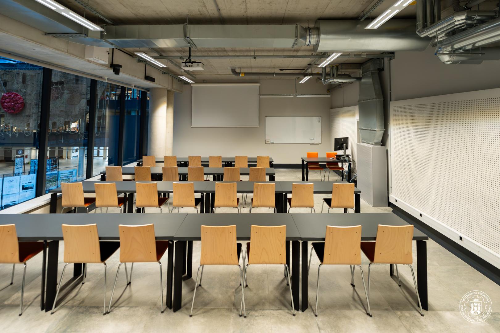 Wcześniej ze środków Uczelni sfinansowano realizację dwóch sal hybrydowych: na potrzeby Wydziału Technologii Chemicznej (sala 001A w budynku A28), a także dla Wydziału Inżynierii Lądowej i Transportu (sala 427 w budynku A1).